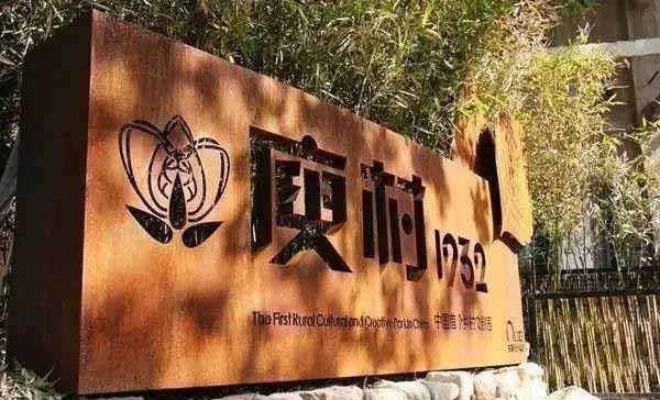 庾村,位于浙江德清縣莫干山的山腳下。村標(biāo)采用銹板雕刻,符合了工業(yè)時代復(fù)古的氣息,并融合了鄉(xiāng)村的元素。