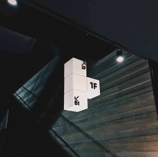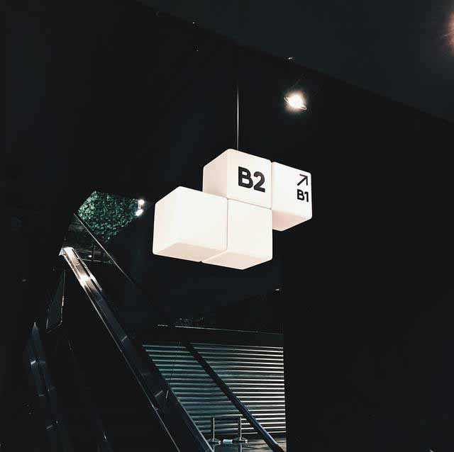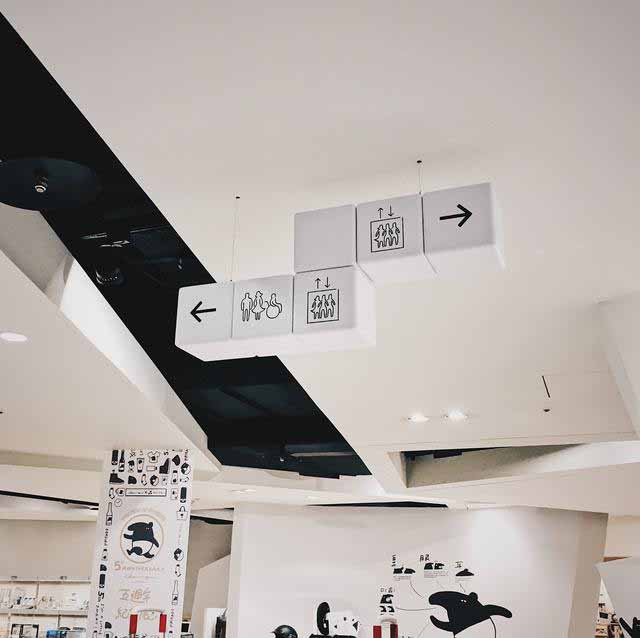商場吊牌都采用了三聚氰胺板制成的正方體塊相組合的形式展示,多樣的組合形式讓它形式多變但風(fēng)格統(tǒng)一,配合以簡潔的標識,成為裝飾它的一部分。讓它很好的融入了整個環(huán)境中,有沒有很像俄羅斯方塊!