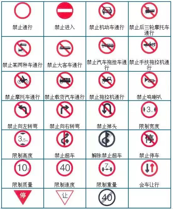 ③ 禁令標(biāo)志:通常為圓形,白底紅邊,紅斜杠黑色圖案。是根據(jù)街道、公路和交通量情況對(duì)車輛加以禁止或適當(dāng)限制的標(biāo)志。如禁止通行、禁止停車、限制速度、限制重量、限制寬度等。