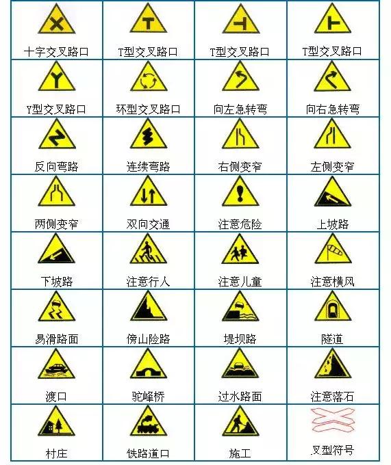 ② 警告標(biāo)志:通常為等邊三角形(或菱形),黃(白)底黑(紅)邊,黑色(或深藍(lán)色)圖案。用于警告駕駛?cè)藛T注意前方路段存在的危險(xiǎn)和必須采取的措施。如預(yù)告交叉口、道路轉(zhuǎn)彎、鐵路道口、易滑路段、可能落石路段、不平路面、合流交通等。